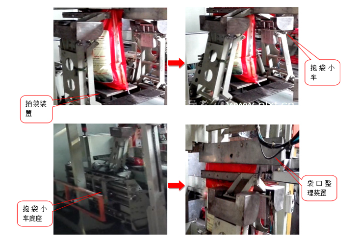 定量包裝機(jī)下料灌裝的過程中,底部的拍袋裝置啟動(dòng),確保袋內(nèi)物料充填緊密。灌裝結(jié)束后拍打停止,下料口夾袋裝置打開,充填物料后的包裝袋在下料口放下的同時(shí),由送包小車經(jīng)專門加工的用于粉體、顆粒物料料袋的抱包、夾包裝置將料袋中部抱住,袋口夾住,送至活動(dòng)導(dǎo)入裝置,活動(dòng)導(dǎo)入與熱合縫包一體機(jī)系統(tǒng)相連.經(jīng)其進(jìn)入封口傳動(dòng)鏈中,保證袋口成一字形。在導(dǎo)入器附近增加吸塵口,通過與除塵系統(tǒng)連接可吸走夾住袋口時(shí)飛出的粉塵.